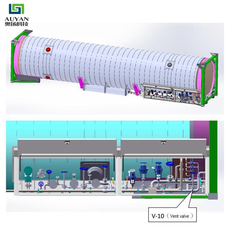 40-футовый контейнер-цистерна СПГ ISO (ASME) в основном состоит из рамы, корпуса резервуара, рабочего блока, системы внешних трубопроводов, маркировочной краски и других аксессуаров.